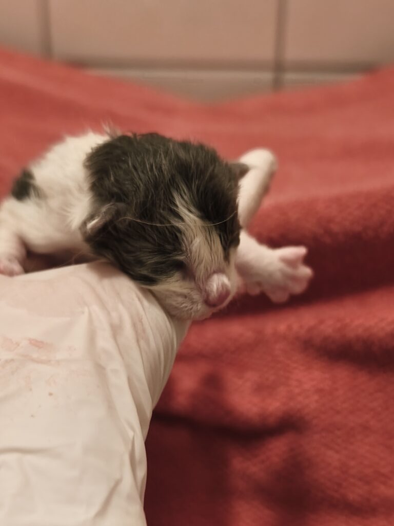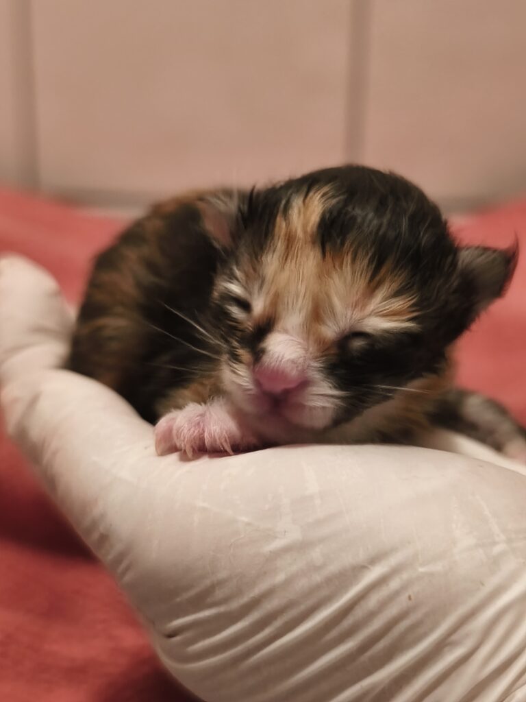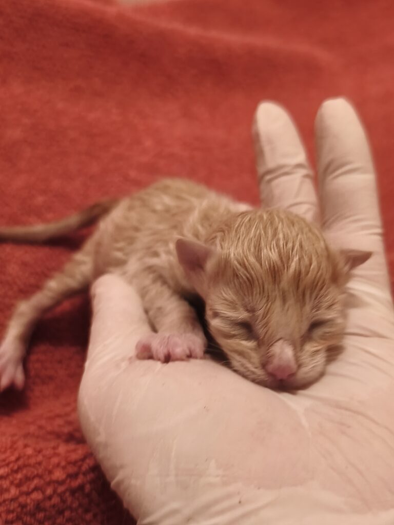 Jedyny chłopak w miocie C. Nadal szukamy dla niego odpowiedniego imienia. Rudy początkowo nas zmartwił. Mimo, że urodził się największy – 126g!, to nie bardzo chciał ssać. Musieliśmy dokarmiać leniuszka przez kilka pierwszych dni. A to nie łatwa sprawa. Co 2-3 godziny w dzień i w nocy dostawał mleczko ze strzykawki. Dokarmiając kociego noworodka, trzeba pamiętać, że mały brzuszek może pomieścić tylko 4ml mleczka na 100g wagi na jeden posiłek. Przekarmienie grozi cofaniem się pokarmu do gardła i jest duże ryzyko zachłyśnięcia!